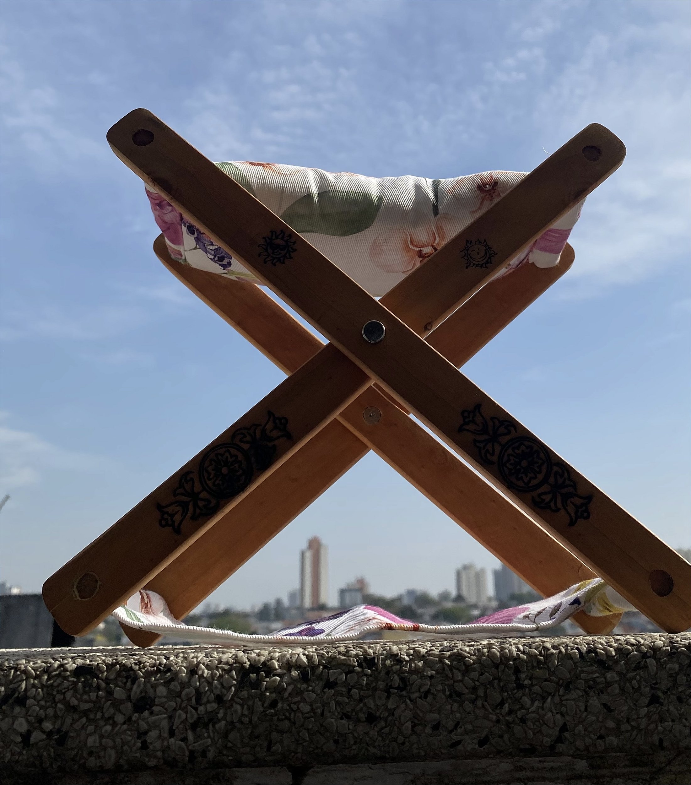 Tem um formato de banco, é dobravel, revestido com espuma e prático de transportar (cabe em uma bolsa de praia).