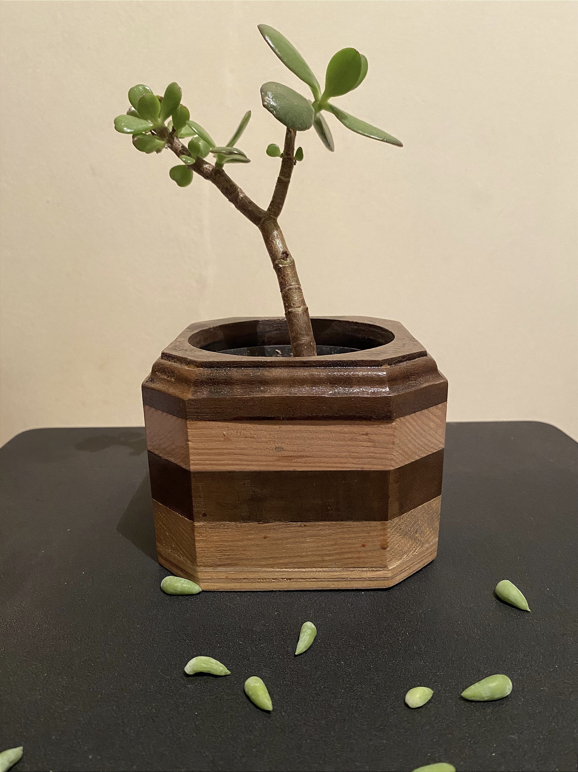 Cachepô para vasinhos de plástico em madeira. Feitos de maneira artesanal (sujeito a algumas imperfeições comum em madeira), envernizado (Cachepô octogonal)
